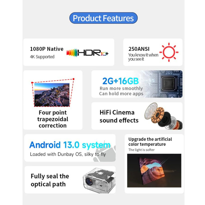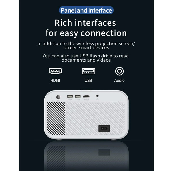 CY900 Smart Projector, Full HD 1080P, 4K Supported, Android 9, Electronic Focus, Auto Keystone, 300 ANSI Lumens, Dual WiFi, HDR Audio, Bluetooth, 5W Speaker, HDMI, USB, AV Port (White)