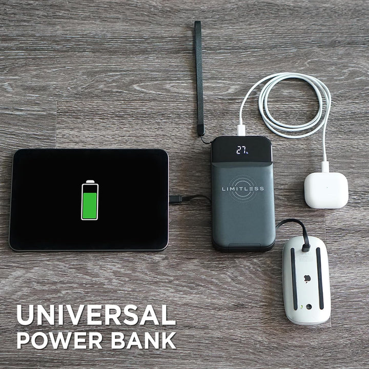 Limitless Innovations Ultimate Pro 15,000mAh Portable Power Bank PD 20W with Built-in Cables, Wireless Charging, Flashlight, Wall Plug, & Digital Display, for iPhone, Samsung, & More (Black Metallic)
