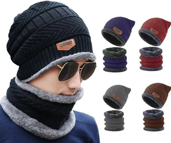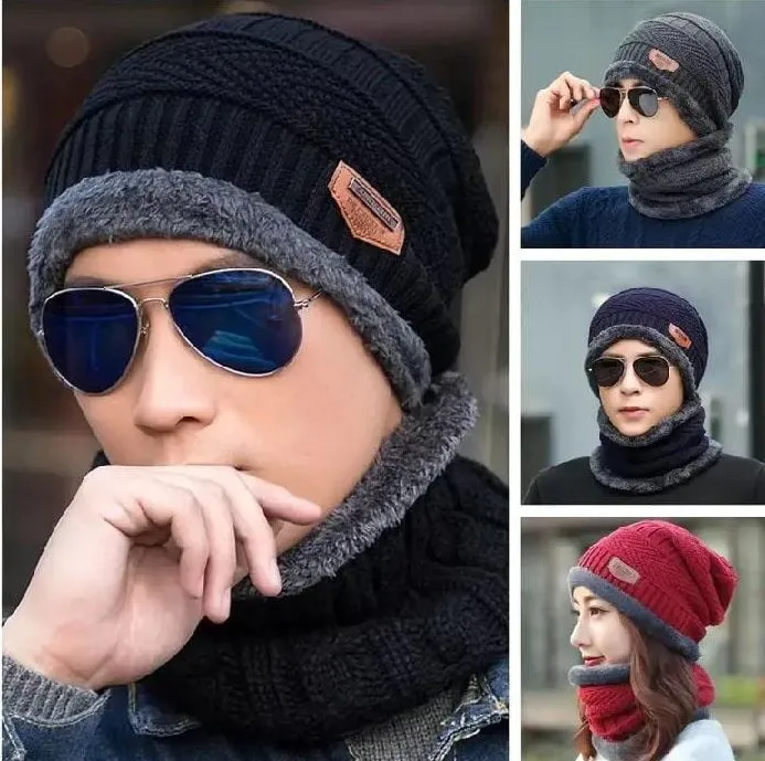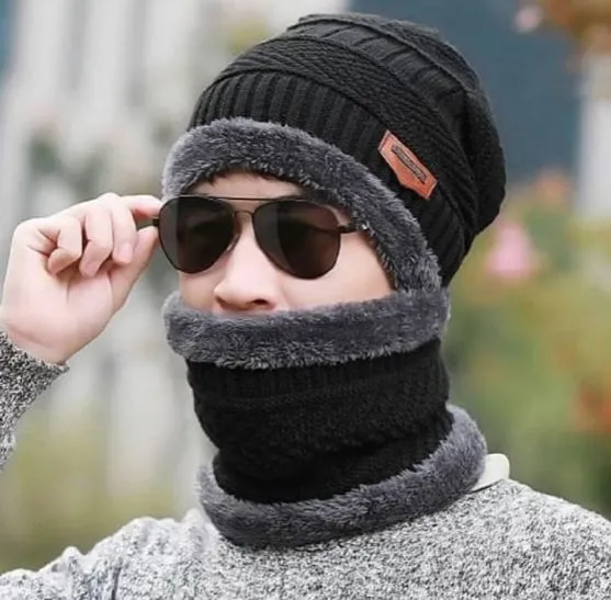 Winter Cap Set Caps with Fur Lining, Beanie Cap & Muffler for Men & Women| Beanie Cap| Woolen Topaa| Winter Cap| Head & Neck Warmer| Black Color| 1 Set|